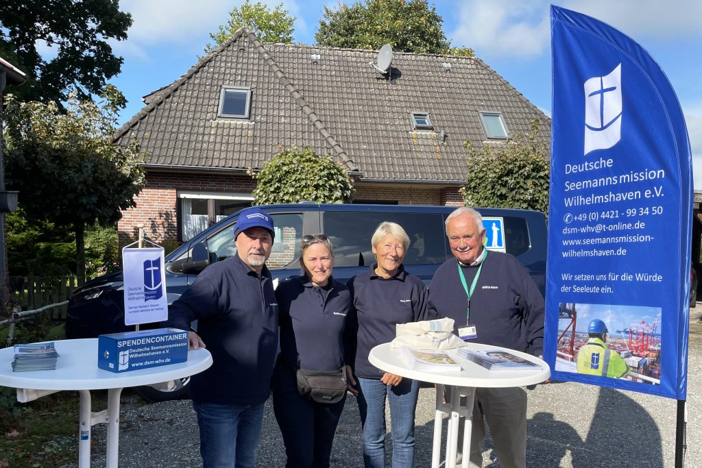 Die Kirchengemeinde Fedderwarden feierte am Sonntag, 14. September, ein besonderes Jubiläum: Vor 775 Jahren wurde ihre St. Stephanus-Kirche erbaut. Zu dem kleinen Fest im und am Gemeindehaus war die Deutsche Seemannsmission eingeladen worden, die sich dort mit einem Informationsstand präsentierte. Rede und Antwort standen von links die Schiffsbesucher Uwe Sassenburg, Bettina Stumpf, Dörte Salverius und Vorsitzender Wilfrid Adam sowie Seemannspastor Dr. Klaus Lemke-Paetznick (nicht im Bild).