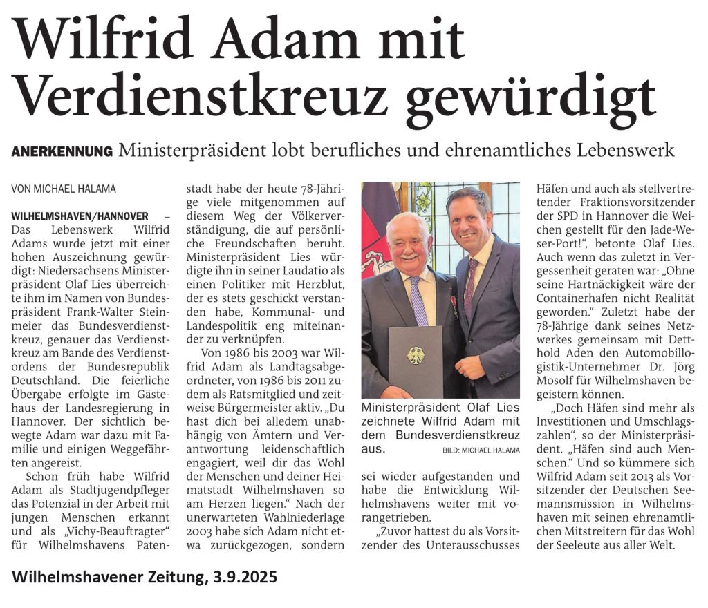 Wir gratulieren unserem Vorsitzenden der Deutschen Seemannsmission in Wilhelmshaven Wilfrid Adam zur Verleihung des Bundesverdienstkreuzes am Bande.