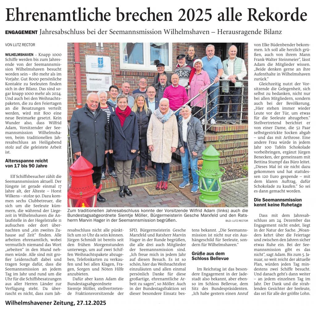 Mit dem steigenden Schiffsaufkommen in den Wilhelmshavener Häfen steigt auch die Zahl der Schiffsbesuche der Wilhelmshavener Seemannsmission. Nach einer Information des Vorsitzenden der Seemannsmission Wilfrid Adam, besuchten die 15 ehrenamtlichen Schiffsbesucher, darunter 4 Frauen, im ersten Halbjahr 2025 insgesamt ca. 490 Schiffe und hatten dabei Kontakt zu ca. 6000 Seeleuten der unterschiedlichsten Nationalitäten. Das Haus der Seemannsmission besuchten 329 Seeleute um dort einen Teil ihrer Freizeit zu verbringen.