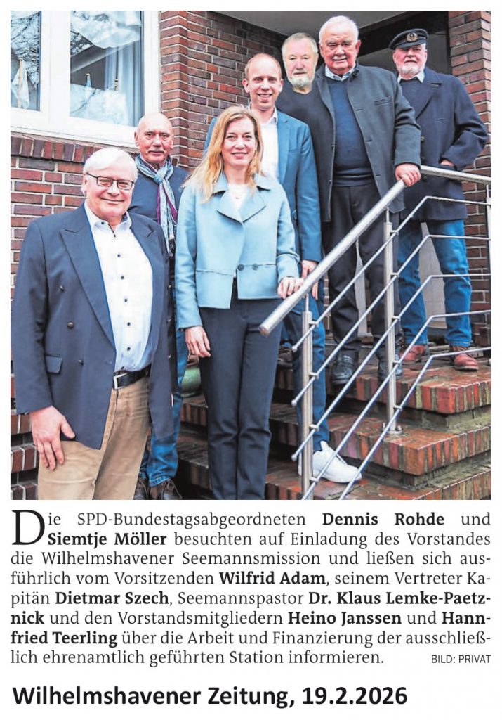 Mit dem steigenden Schiffsaufkommen in den Wilhelmshavener Häfen steigt auch die Zahl der Schiffsbesuche der Wilhelmshavener Seemannsmission. Nach einer Information des Vorsitzenden der Seemannsmission Wilfrid Adam, besuchten die 15 ehrenamtlichen Schiffsbesucher, darunter 4 Frauen, im ersten Halbjahr 2025 insgesamt ca. 490 Schiffe und hatten dabei Kontakt zu ca. 6000 Seeleuten der unterschiedlichsten Nationalitäten. Das Haus der Seemannsmission besuchten 329 Seeleute um dort einen Teil ihrer Freizeit zu verbringen.
